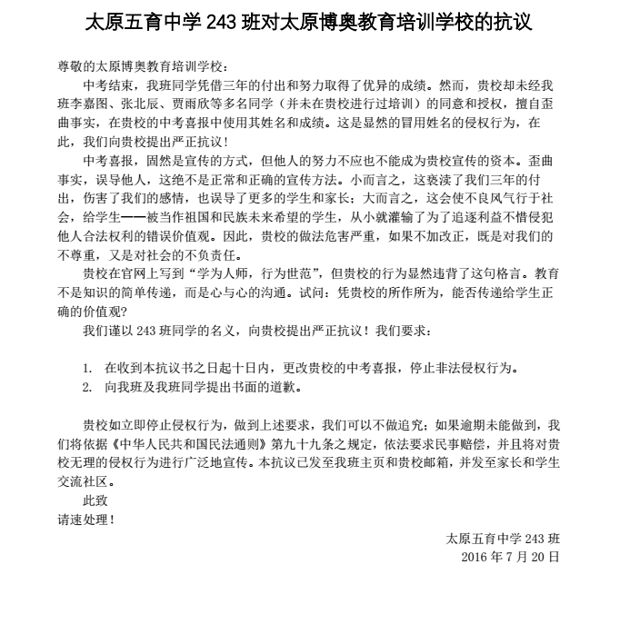 鉴于太原博奥教育培训学校近日在中考喜报上未经授权的使用我班多名同学(未进行过与其相关的培训)的姓名和成绩,发出如下的书面抗议: